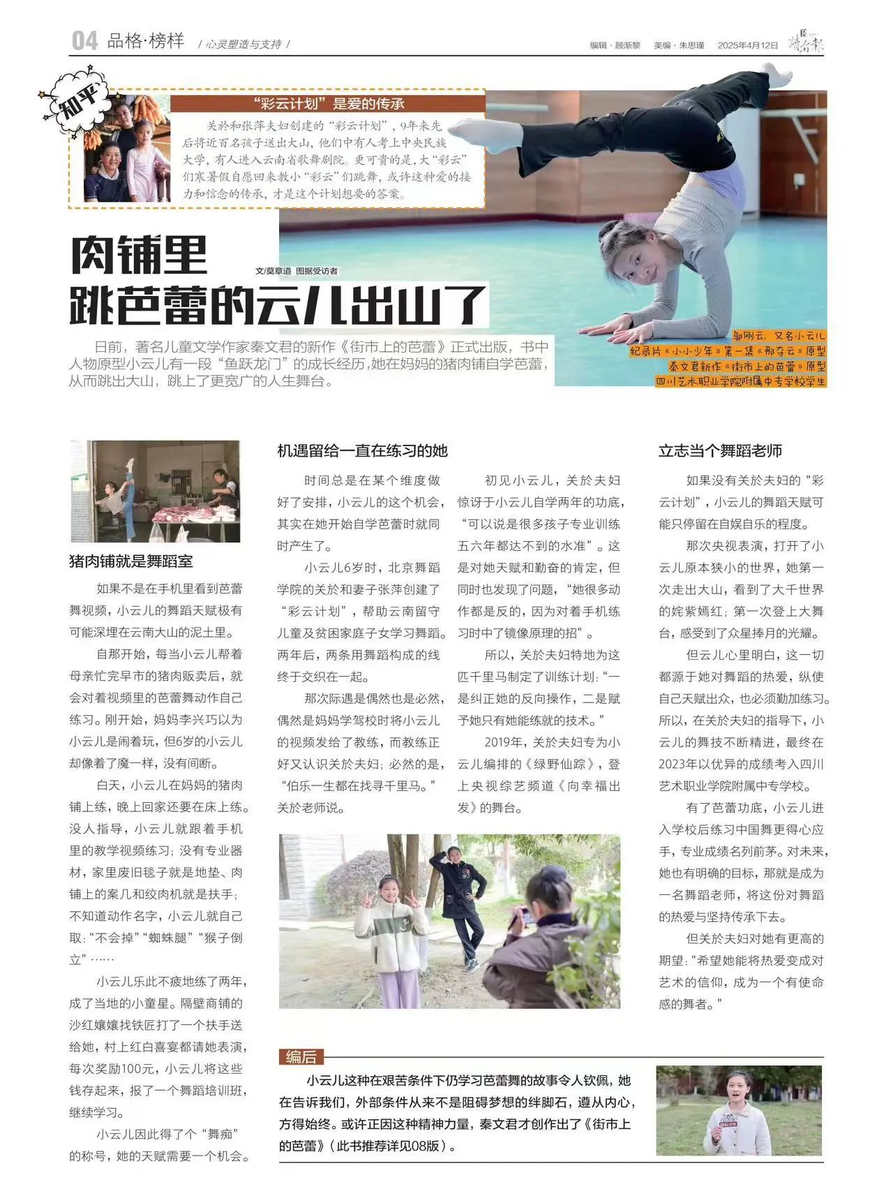 小云兒6歲時,北京舞蹈學院的關於和妻子張萍創建了“彩云計劃”,幫助云南留守兒童及貧困家庭子女學習舞蹈。