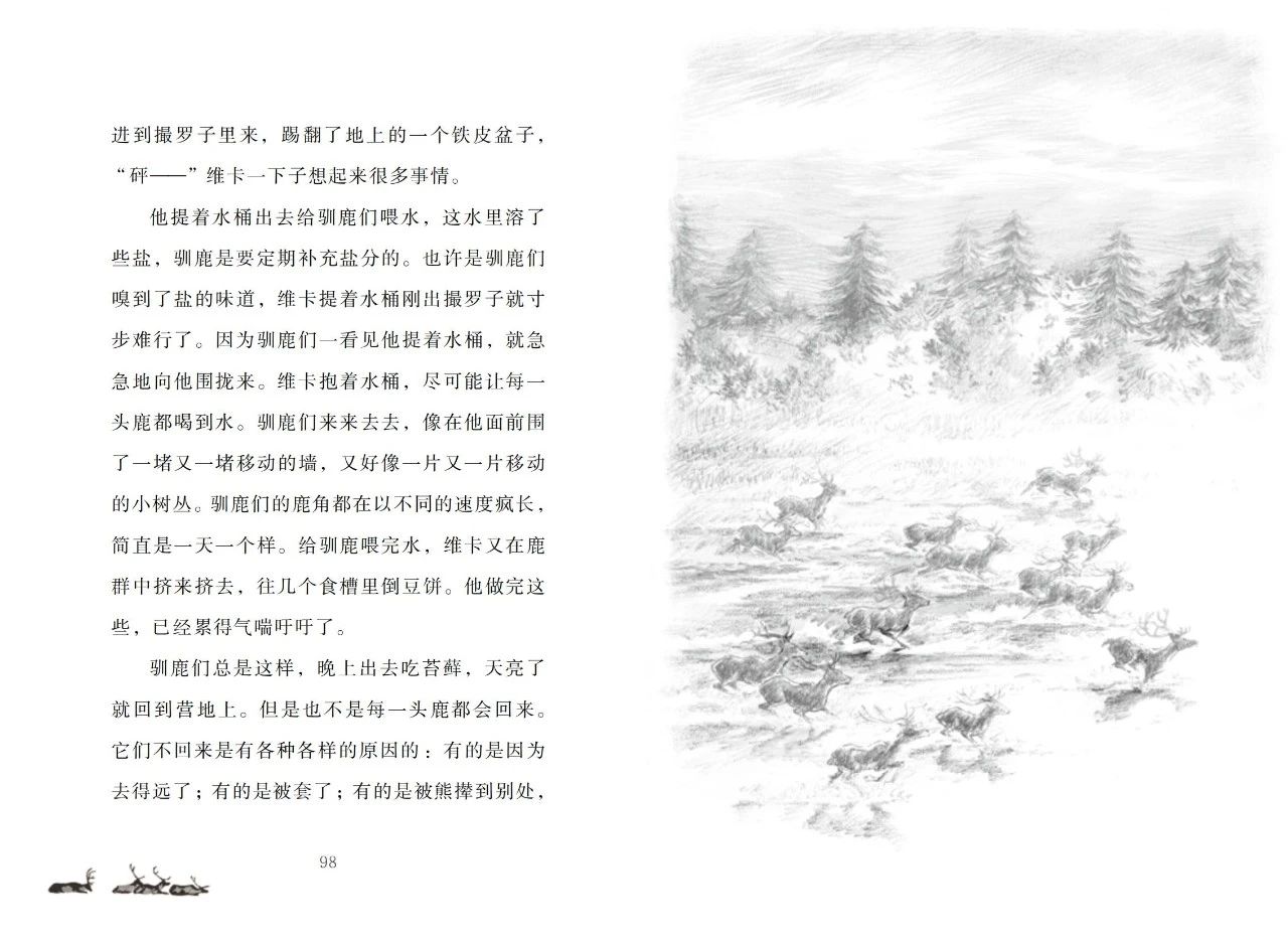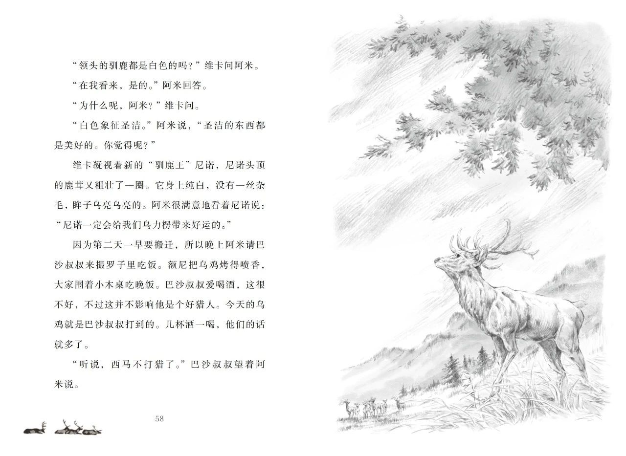 敖魯古雅鄂溫克族是我國最后一支使鹿部落,是唯一飼養馴鹿的民族。《馴鹿營地》從“少年維卡有了一頭馴鹿”寫起,充滿深情地介紹了馴鹿從幼崽到壯年的成長歷程。鄂溫克人跟隨尋找苔蘚的馴鹿遷徙,“逐鹿而居”,馴鹿之于鄂溫克人,是伙伴,某種程度上更是“精神依托”。