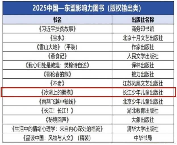 7月4日,2025中國—東盟圖書影響力報告發布會在廣西南寧舉辦。會議發布了《2025中國—東盟圖書影響力報告》和2025中國—東盟圖書影響力出版集團、2025中國—東盟圖書影響力出版社、2025中國—東盟影響力圖書(版權輸出類)、2025中國—東盟影響力圖書(版權引進類)、2025中國—東盟影響力圖書(東盟主題類)五個致敬名單,長江少年兒童出版社獲評《2025中國—東盟圖書影響力出版社,《冷湖上的擁抱》獲評2025中國—東盟影響力圖書(版權輸出類)。