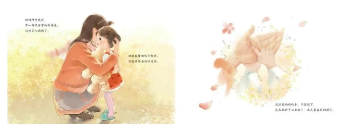 比如《媽媽的秘密》中,前后環襯都出現了櫻花的形象。當讀到這里時,可以引導孩子思考:“寶貝,為什么故事里會出現櫻花呢?”結合當時新冠疫情背景,再告訴孩子:“櫻花盛開代表著希望和新生,就像抗疫勝利的曙光一樣。媽媽和孩子看到櫻花,心里也充滿了對美好生活的向往。”這樣,孩子不僅能更好地理解故事內容,還能感受到故事中蘊含的溫暖與希望,仿佛看到了疫情過后充滿生機的世界。