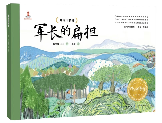 我們再拿起《軍長的扁擔》,閱讀時先看書的封面,說明這本書主要講的是什么精神,再和孩子一起觀察封面中有什么細節,如“扁擔在封面的哪里”,然后可以這樣告訴孩子:“咱們看的這一套繪本就像一個時光寶盒,里面裝著中國共產黨人在不同時期創造的偉大精神。每一本封面上都會告訴你它要講什么精神,就像《軍長的扁擔》,封面上寫著井岡山精神,它講的是軍長和戰士們一起干活,不怕吃苦的故事,就像超級英雄們一起戰勝困難一樣!”這樣,孩子會帶著滿滿的期待,迫不及待地投入到20世紀20年代井岡山的故事世界中。