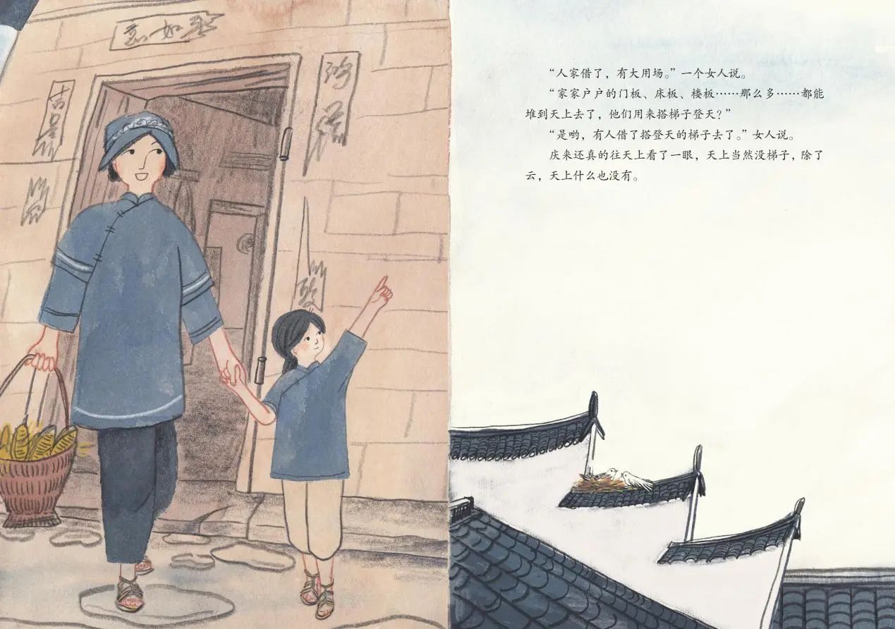 如《鴨綠江北岸》用靈動水彩繪制。翻開書,色彩輕盈,帶著江畔水汽。畫家暈染江水,藍綠相映,色彩過渡自然,人物形象親切溫暖,孩子讀來如臨其境,感受抗美援朝期間我國大后方人民的淳樸與無私奉獻。