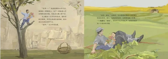 色彩搭配在繪本中也起著至關重要的作用。以《山丹花開》為例,畫面以土黃色和綠色為主色調,土黃色象征著太行山的廣袤土地,綠色則代表著生機與希望,與故事中軍民魚水情、頑強奮斗的精神相契合。這里,可以讓孩子感受色彩帶來的氛圍,問他們:“看到這些顏色,你心里有什么感覺?它們和故事里軍民的情感有什么關系呢?”讓孩子仿佛置身于太行山的懷抱中,感受到那份軍民之間的深厚情誼。