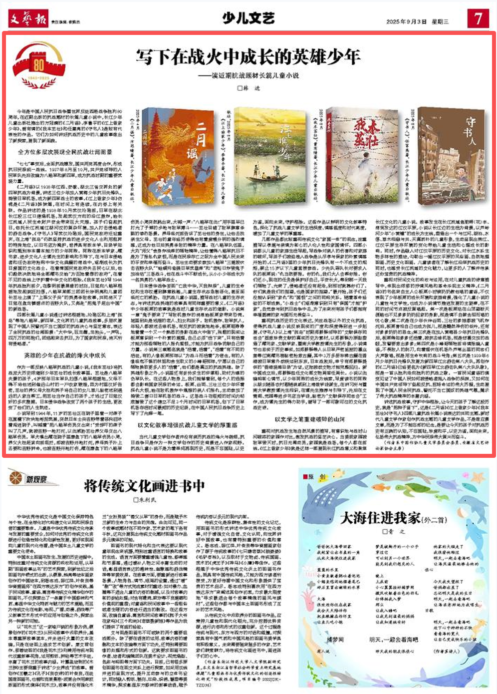 今年是中國人民抗日戰爭暨世界反法西斯戰爭勝利80周年,在近期出版的抗戰題材的長篇兒童小說中,長江少年兒童出版社推出的方冠晴的《二月謠》、李魯平的《江上誰家少年》、曾有情的《我本茁壯》和任富亮的《守書人》是較有代表性的作品。它們為如何講好抗戰歷史中的兒童故事做出了新探索,展現了新面貌。