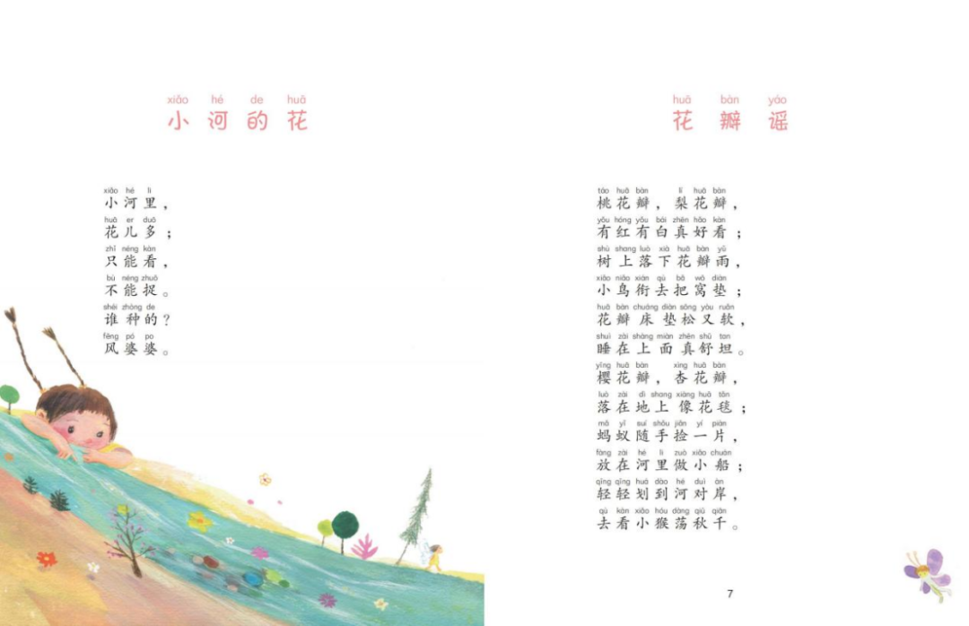 這是一首好美又好玩的童謠。動感的語言,描繪出一幅花飛蝶舞的畫面,更令人贊嘆的是疊字疊韻巧用,賦予了童謠律動的節奏、婉轉的旋律、別樣的語趣。這樣的童謠雖然出自成人之手,但歌謠之風韻、童聲之甜美盡在其中,孩子們一讀就黏上了它。童謠世界里孩子是歌者,他們在游樂中歌唱。我看過舞臺上演唱這首童謠的節目,小天使們樂此不疲,好像都成了蝴蝶和花朵,在開心地游戲。神游中,他們飛來飛去,邊舞邊唱,童聲童氣,猶如天籟。我贊美母語的神奇魔力,我看到文字排列的兒歌,變成隨口即興的歌謠,瑯瑯于孩子生活的草地上。