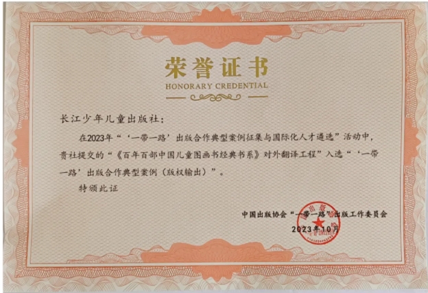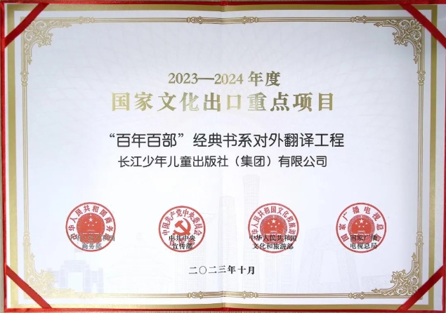 “百年百部”經典書系對外翻譯工程入選中宣部、商務部等五部委聯合頒發的2023—2024年度國家文化出口重點項目,《百年百部中國兒童文學經典書系》對外翻譯工程入選2021年中國出版協會“一帶一路”出版合作典型案例,《百年百部中國兒童圖畫書經典書系》對外翻譯工程入選2023年“一帶一路”出版合作典型案例(版權輸出),兩套書系中的多本圖書入選國家級翻譯資助項目和獎項。