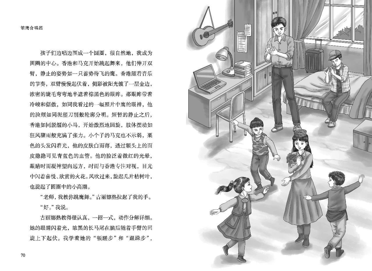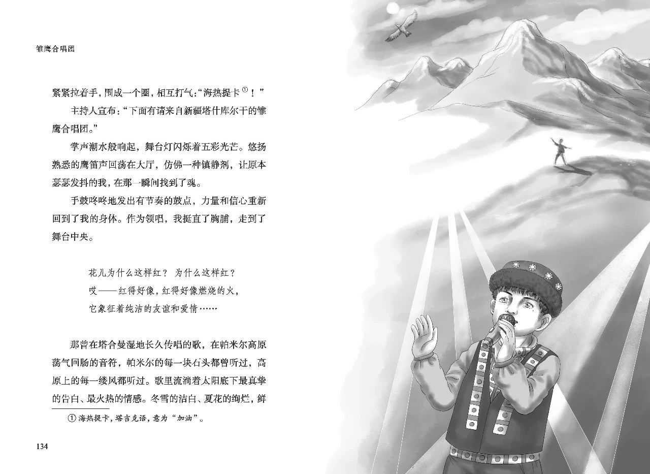 作為現實主義兒童文學作品,小說很好地呈現出邊疆時代新貌。作品聚焦于新疆喀什地區塔什庫爾干塔吉克自治縣的一個小山村——皮勒。過去,這個小山村由于交通不便,孩子們的求學路十分艱險,需要攀援懸崖峭壁,溜索過咆哮的大河。2013—2014年,在各方的關注和支持下,皮勒的公路和大橋通車了,人們出行便利多了,孩子們上學再也不用爬懸崖、溜索道了。書中描繪出塔吉克族小學煥然一新的面貌。在兩位漢族支教老師的帶領下,興趣特長班“雛鷹合唱團”成立。塔吉克少年們由此走出封閉的高原小山村,走上了更大的舞臺。邊疆鄉村地區民族團結、尊師重教的面貌令人欣喜。