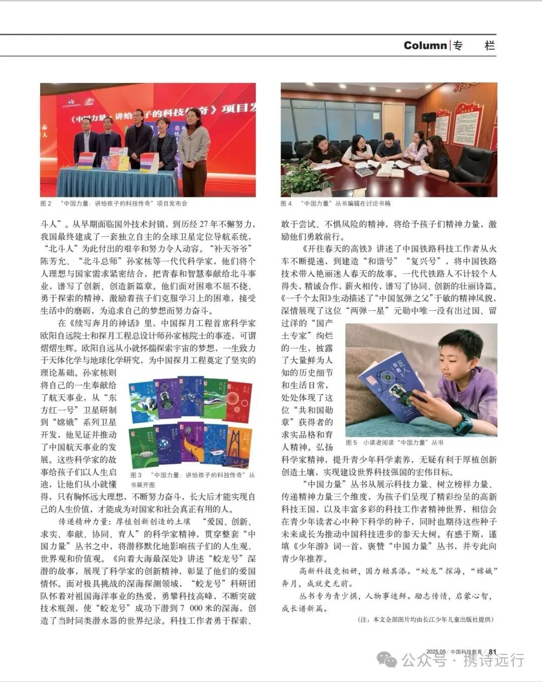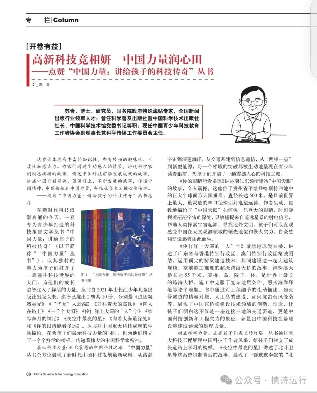 《中國力量》叢書從展示科技力量、樹立榜樣力量、傳遞精神力量三個維度,為孩子們呈現了精彩紛呈的高新科技王國,以及豐富多彩的科技工作者的精神世界,相信會在青少年讀者心中種下科學的種子,同時也期待這些種子未來成長為推動中國科技進步的參天大樹。有感于斯,謹填《少年游》詞一首,褒贊《中國力量》叢書,并專此向青少年推薦。